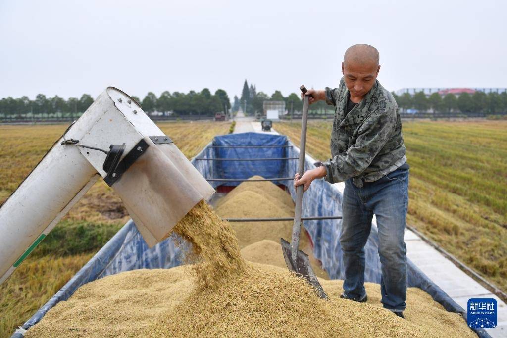 10月29日,在大通湖区河坝镇王家湖村,农机手驾驶收割机将稻谷装车。